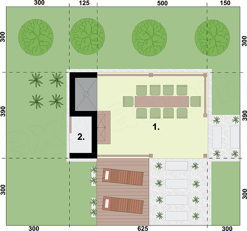 Osobiście jestem zachwycona tym projektem. Podoba mi się też pomysł z niewielkim, słonecznym tarasikiem przy altanie. Trochę słońca, trochę cienia, dużo miejsca i wszystko pod ręką. Tylko wypoczywać!