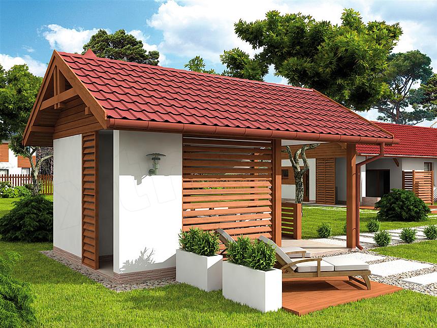 Rozwiązanie ekskluzywne i bardzo eleganckie. Budynek jest murowany ale wykończony drewnianą deską elewacyjną co sprawia, że całość wygląda przytulnie. Powierzchnia użytkowa to prawie 20 m2. Mieści się tu duży stół wokół którego można swobodnie ustawić 10 krzeseł. Idealny na biesiadowanie w szerszym gronie. Wewnątrz wbudowany jest elegancki grill. Jest też miejsce na drewno do grillowania i poręczne, zamykane szafki.